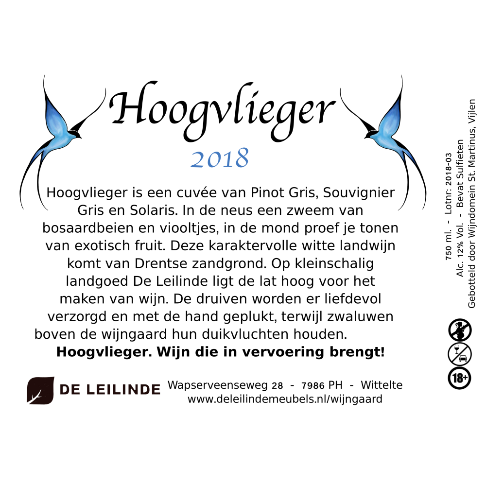Deze karaktervolle witte landwijn komt van Drentse zandgrond, Op kleinschalig landgoed De Leilinde ligt de lat hoog voor het maken van wijn. De druiven worden er liefdevol verzorgd en met de hand geplukt, terwijl zwaluwen boven de wijngaard hun duikvluchten houden.